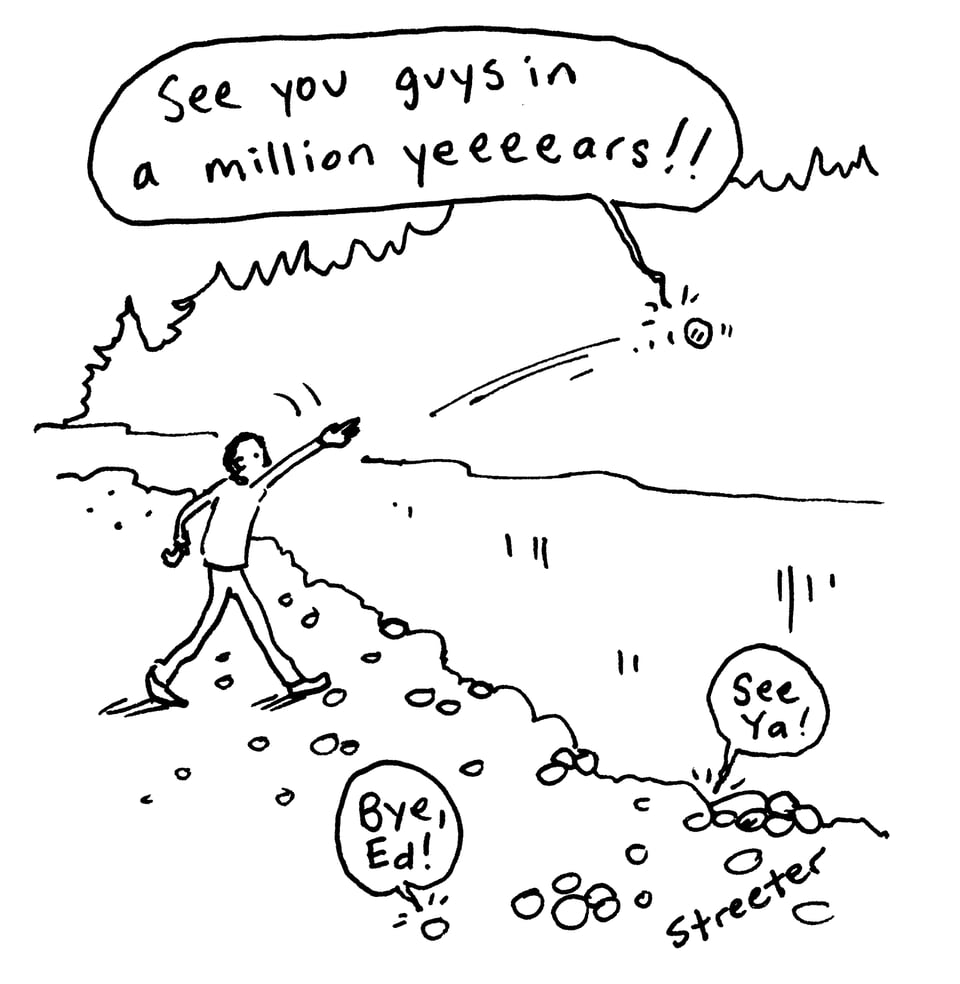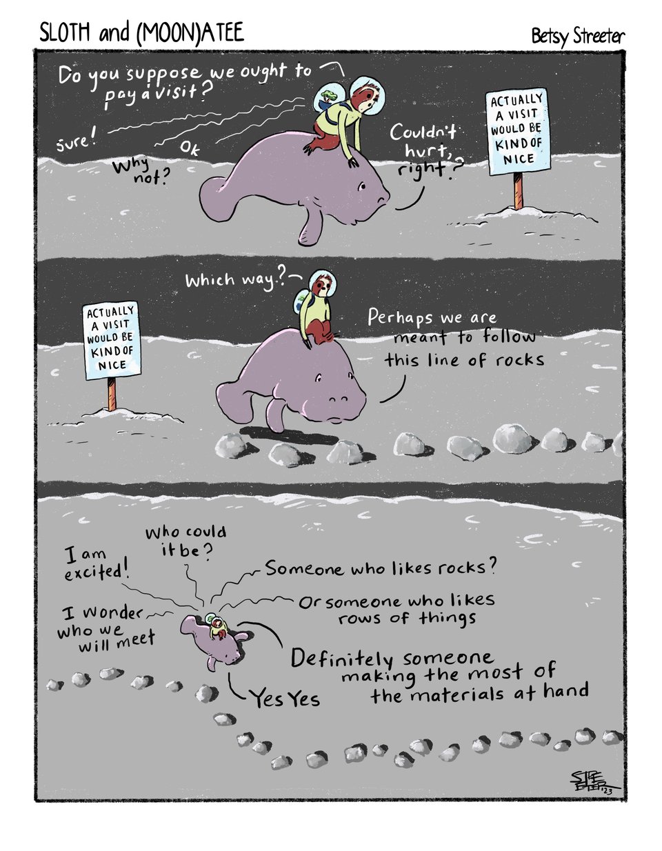 The gang have decided to visit whoever put up these signs on the moon’s surface - but where might they be? Are they at the end of this long row of moon rocks? Someone has been busy moving rocks around.