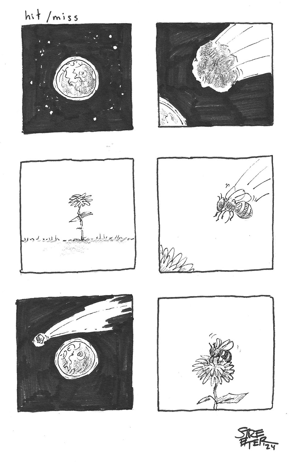 It's hard to talk about time without talking about space (thanks Albert Einstein et al) since they are part of each other, which is maybe why I drew this lil comic last week called "hit/miss" although I'm now thinking it should have been called "miss/hit" but here we are