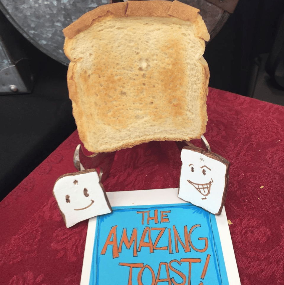 Which I made when Bridgett Spicer and Alex Schumacher and I were sharing a table at the Big Wow comic con in San Jose in 2014. We had become very punchy (cons are tiring) and started yelling “TOAST!” at people which did not sell a lot of comics. The toast then accompanied us to more cons and became a bit of a celebrity in its own right: