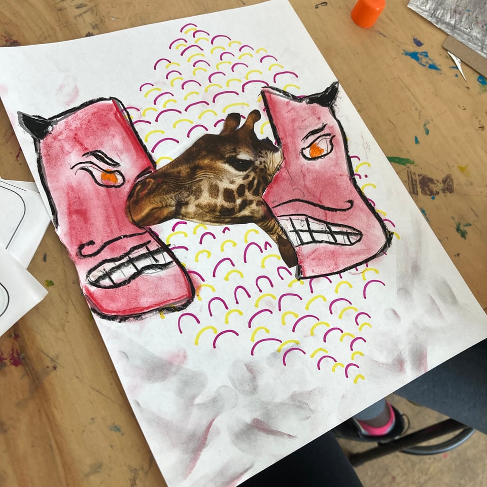 I talked with the kids about art as reference and response, and suggested to them to mix their media and ideas, and put out stuff for collage and drawing - one of them made this: