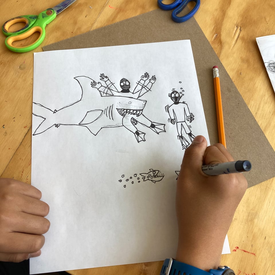Thought I’d share some Art of the Youth, made at Richmond Art Center after I had given an art tour to a group of sixth-graders. I love the way this artist has given the diver many arms to get across the frantic-ness of the situation.