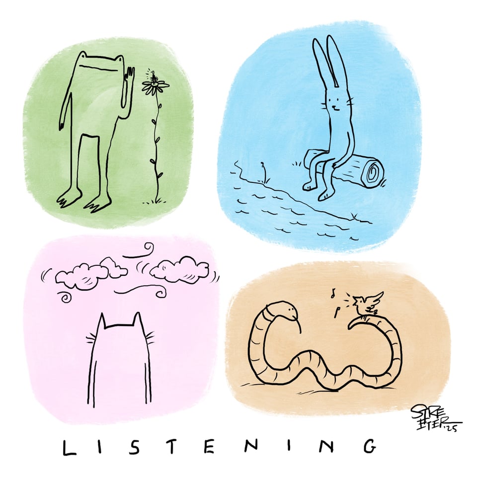 Thinking a lot about listening currently - when we really, really listen, a whole other part of our brain kicks in. Listening is real-time and every sound we hear is a once-in-a-lifetime, or in-eternity, actually, experience. That sound wave happens once. And it belongs to us only. We hear what we hear, from where we are. And listening can take the form of feeling, too. Frequencies and vibrations. Come along and listen.
