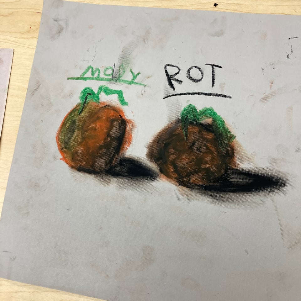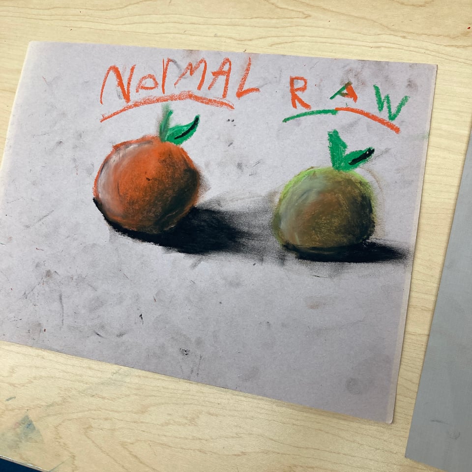 I show you not to be about kids as measured by ‘adult’ standards, as beautiful as these are - this is cool because of the way it happened. There was the kid, and the orange, and the pastels, and an environment where everything was okay. These were the circumstances. There was no right way to draw, everybody in the room was doing their thing - some planets, some snow, roses, lists of slang words, whatever. Somebody I think had a crush on a kid who wore green crocs and so they were drawing green crocs.