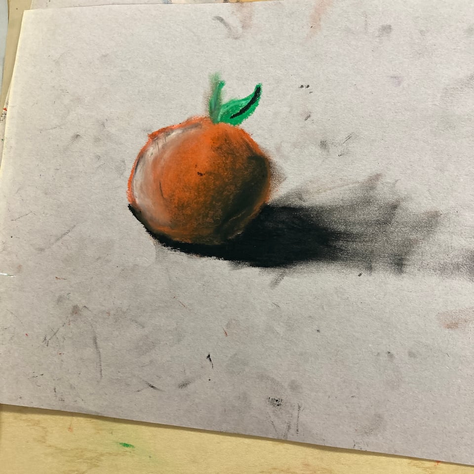 The thing of the week is this orange, drawn by a fourth-grader. I draw with kids after school, a couple days a week. This week I had some pastels out. Somebody had left a bowl of oranges in the room. This kid said, “can I draw that?” and I said of course, and he did this: