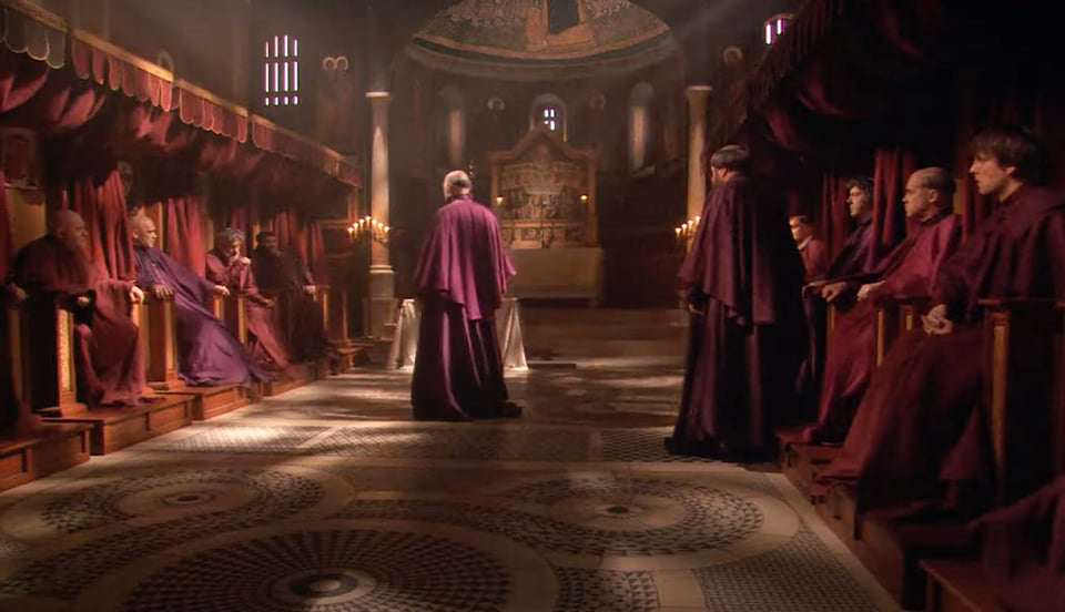 I’ve long been fascinated by the politics of the papacy, and conclaves in particular. So, as Francis’s health deteriorated this winter, I began to read and watch everything I could get my hands on. In just the last few months, in addition to “Conclave”, I’ve watched “The Conclave” from 2006, about the 1458 papal election. I’ve done a rewatch of “Borgia: Faith and Fear”, which devotes more than two hours to the 1492 conclave. I’ve read Behind Locked Doors: A History of the Papal Elections by Frederic J. Baumgartner, The Conclave by Michael J. Walsh, The Bad Popes by E.R. Chamberlain, and Absolute Monarchs: A History of the Papacy by John Julius Norwich. To be perfectly honest, I may not have read all of them cover to cover; my focus was on the renaissance papacy, because renaissance Italy is my version of Talia’s preoccupation with polar exploration. I’m obsessed.