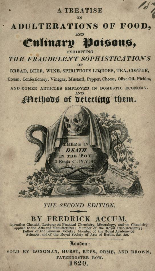 That's really where the Wiley story comes into it. You have all of these different really bad things that are going into the industrial food supply. In England, there's a book, A Treatise on Adulteration of Food and Culinary Poisons, that came out in 1820 that talks about the use of heavy metals in the food supply—arsenic as a green food coloring, copper sulfate as a green food coloring, lead as both a yellow and orange food coloring. And eventually, through that and a series of scandals, Britain passed a food safety law in 1860.