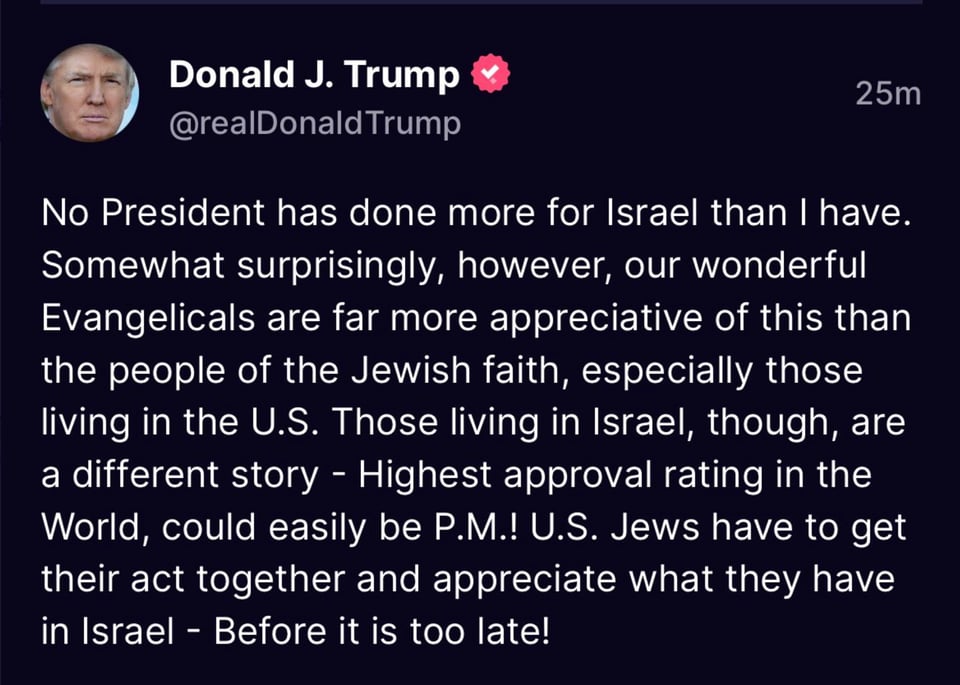 The thing about the second coming of Jesus, as imagined by many fundamentalist evangelicals, is that, when you get down to it, it all … depends … on the Jews. The Jews in Israel in particular. That’s why Trump gave that big sloppy kiss of an encomium to evangelical Christian Zionists recently, noting how grateful they all are about his support for Israel.