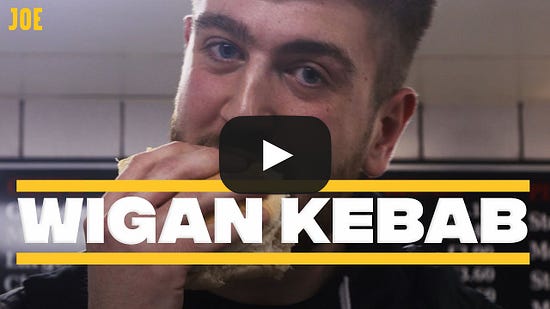 Generally the debate centers around claims of creation: was the French Dip invented at Philippe or Cole's? Where did the first Cuban sandwich appear, Tampa or Miami? In the case of today’s sandwich, the question isn’t so much who came up with the idea. (It was probably some hungry Glaswegian—or Wiganite, or Dundonian—who was served a pie so scalding hot that the only way to protect his or her fingers was to place it in a roll.) I’m more interested in who can claim its naming rights. In the Greater Manchester/Merseyside corridor they call it a “Wigan Kebab,” as evinced in the viral video below, in which a hapless vlogger consumes one, alongside local delicacies “smack barm pey wet” and “babby’s yed,” in a communion of carbohydrates.