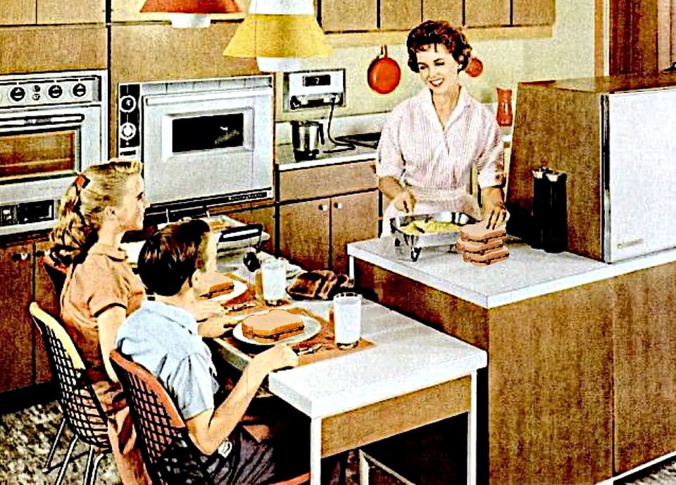So what made the PB&J take a flying leap from Depression handout menus and faut de mieux lunches scorned by manly men to centrality in the national image of domestic bliss? The answer lies, as it often does, with nostalgia, no matter what the rose tint of the image of childhood obscures. By the 1950s, a mania for processed and ready-to-eat foods—the generation that embraced aspic with both hands—prevailed in a newly prosperous postwar America. Coupled with a smothering cult of domestic perfection among housewives, the era of the Baby Boom created the preconditions for a howling need for an easy-to-prepare sandwich to fill the household assembly line.