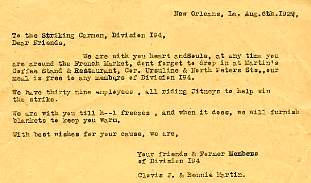 But spectacle alone, or even the abstract sympathy of crowds, can’t feed a family, let alone a thousand strikers. Enter restaurateur brothers Clovis and Bennie Martin, proprietors of a café in the French quarter. They published the following letter in August 1929, a month into the strike, just when zeal might be eroded by hunger: