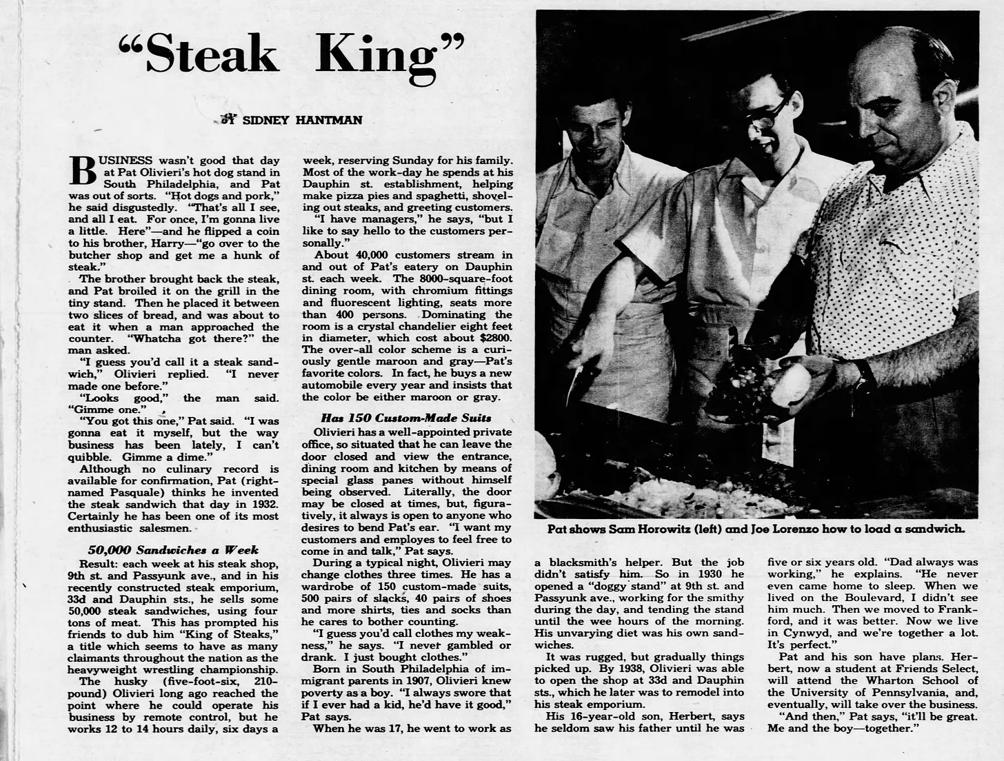If you’ve made it this far, I feel I must offer you at least one solid bite of information, and my editor, the indefatigable David Swanson, dug up a lovely book for me—Carolyn Wyman’s The Great Philly Cheesesteak Book, published 2009, which reflects on most of a century of this sandwich. It’s generally agreed upon that Pat Olivieri, a first-generation Italian-American, grew heartily sick of slinging hot dogs on the Philly streets, started selling thinly-sliced steak sandwiches in 1932, and birthed a phenomenon. According to Wyman, who interviewed Olivieri’s third wife and great-nephew (the current proprietor of Pat’s King of Steaks), the elevation of his creation into legend had more to do with Olivieri’s talents as a showman than the innate distinctive qualities of the sandwich—he delivered cheesesteaks free to the stars of the day, like Bogart and Tony Bennett and Louis Armstrong, and drove them back to Pat’s in his red Cadillac.