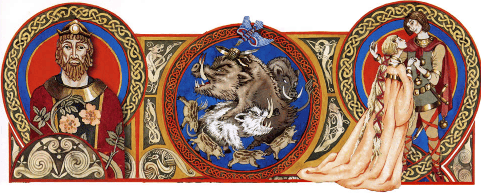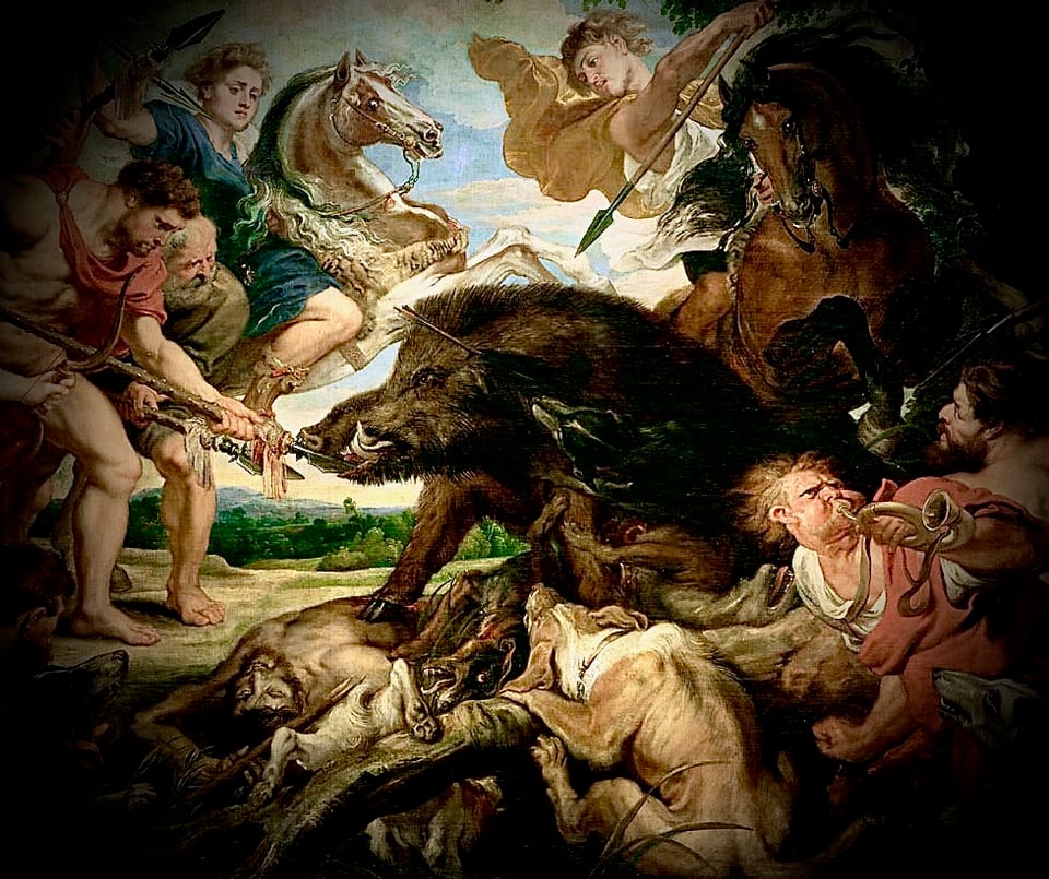 In the high Medieval days boar-hunting (and boar consumption) was the province of nobles, who lanced the tusked beasts that fed on forest mast. The ancient Greeks disseminated the legend of the hunt for the Calydonian Boar, a mythic man-eater sent in vengeance by the hunt goddess Artemis to punish a king, and shot-through with an arrow by the huntress Atalanta. Not to be outdone, King Arthur hunted a mythic boar too, with the fabulous Welsh name Twrch Trwyth, aided by his great hound Cavall; he drove it from Ireland to Britain and cast it from the cliffs at Cornwall. Medieval cooks, aping Apicius of the Romans, sewed capons to pig haunches, creating fabulous heraldic beasts out of swine.