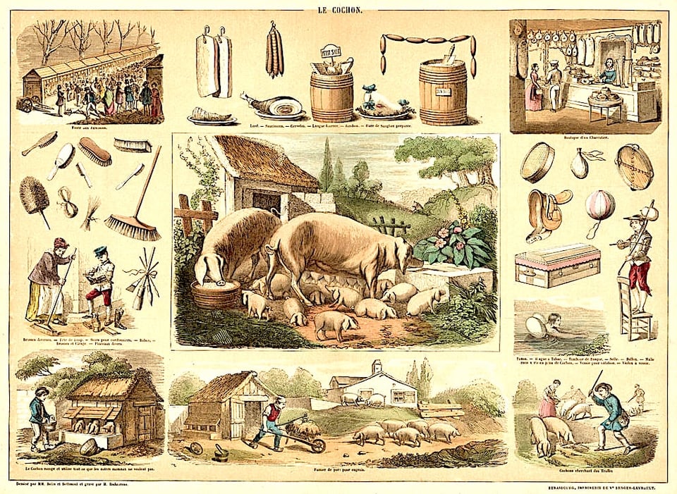 The first thing to note is a pig is a pig—or boar or swine—but its flesh, in English, is pork. This corresponds with other culinary linguistic quirks: a cow is beef when it’s on a plate, a sheep is mutton. Why? Because the nobles named it, and they’d invaded England under William the Conqueror and spoke French; porc, boeuf, mouton replaced swineflesh, cowflesh, sheepflesh. But the peasantry still herded the pigs; so they stayed swineherds and the swine stayed swine. (Ham has an old Germanic root—the back of the knee, which became the thigh, then the hock of an animal, so already this linguistic-stratification point, which was meant to be eloquent, is muddled. But maybe it was the peasants that did the butchering too, and the nobles that ate tout le porc).