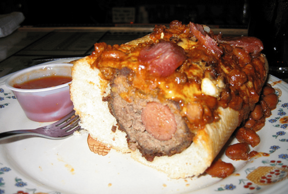 Anyway, one version from Georgia is “a hot dog wrapped by a beef patty that's deep fried, covered with chili, cheese and onions and served on a hoagie bun. Oh yeah, it's also topped with a fried egg and two fistfuls of fries,” according to the AP circa 2005. This is, notably, four years before the Australian hamdog patent, although there’s no evidence that guy traveled the one zillion miles to from Australia to anywhere, let alone Decatur, Georgia. The American version was served in a bar called Mulligan’s which closed a year after that article was written, although no indicia tell me that this was actually due to coronary complications of any kind. Suck it, Australia: we did this first, and bigger, and stupider.