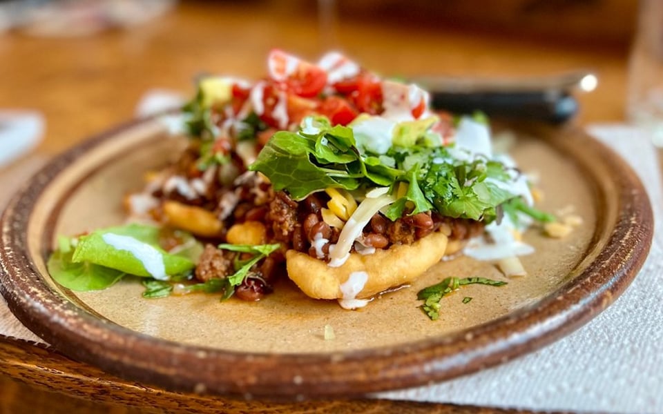 Welcome back to Notable Sandwiches, the feature where I, alongside my charming and long-suffering editor David Swanson, trip merrily through the befuddling document that is Wikipedia’s List of Notable Sandwiches. This week, food writer and friend of the Sword & Sandwich Sara Calvosa Olson returns with a guest column on a Native American favorite that goes by many names: NDN Taco, Frybread Taco, Navajo Taco, or Indian Taco.