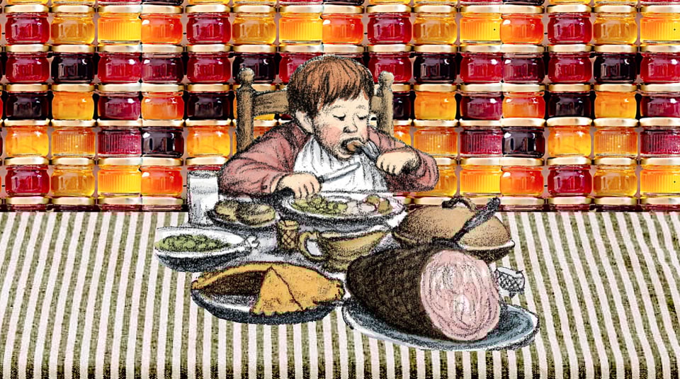 That’s what jam has always been: a way to preserve sunshine in a storehouse, brightness salvaged for times of pall, bounties of warm fruit boiled and sweetened to keep when no fruit grows on the boughs. Laura Ingalls Wilder, chronicler of American homesteading life, describes one winter feast in Farmer Boy (the book that made me the hungriest of any book I have ever read) in which the main character, having been hungry all day, goes absolutely bonkers on the occasion of his teacher visiting for dinner and his parents pulling out all the stops. All the food is winter-preserved—ham from the autumn slaughter, root vegetables, and an array of preserves.