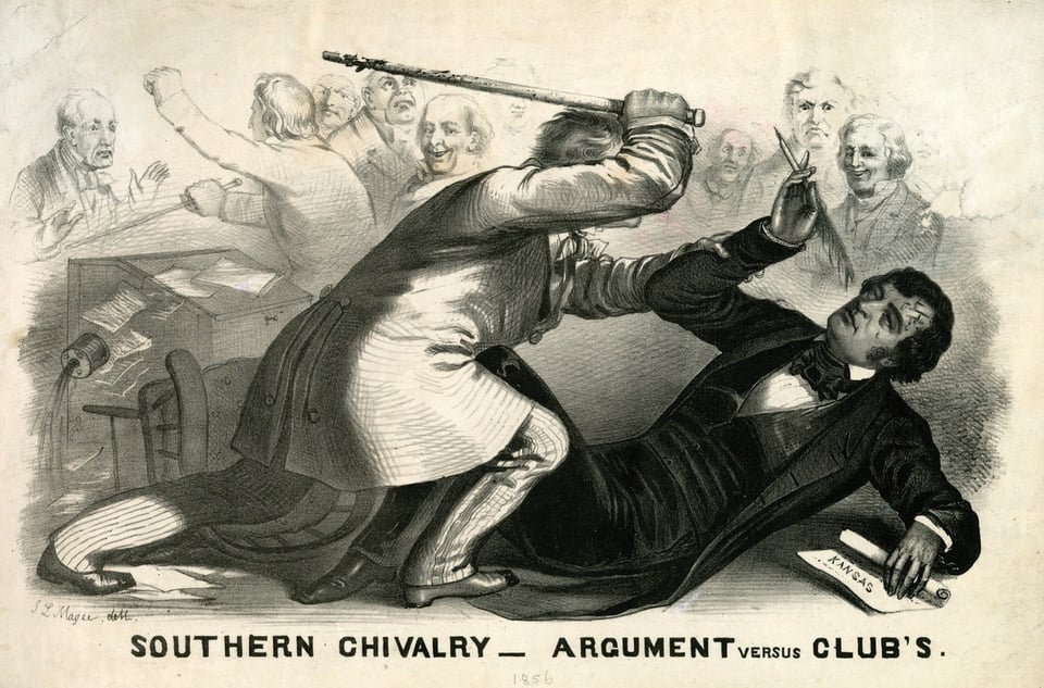 One of the more notorious instances of political violence in American history was an all-out, one-sided beating on the floor of Congress in 1856. Two days before, Massachusetts Senator Charles Sumner had given a rousing, five-hour speech condemning “the harlot, Slavery” and all its proponents. In response, and invoking a “libel on South Carolina,” Representative Preston Brooks struck Sumner on the head with a cane, and continued to strike him until the cane broke, and Sumner lay bleeding on the floor, unconscious. The incident, which caused great outcry in the press, is often used to illustrate the feverish political tensions that led up to the Civil War five years later.