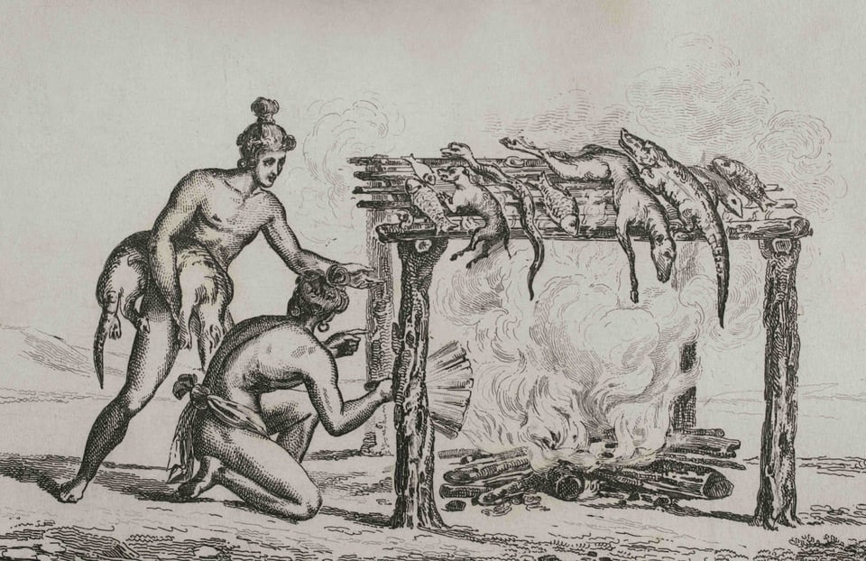The word “barbecue,” most lexicographers agree, is drawn from the Taino language of the Arawak people of the Caribbean, and was used by colonists to describe a standard method of food preservation and preparation among the Native Americans of the Eastern seaboard, from the pit-smoked cockles of Maine to the alligators of Florida, barbecued by the Timicua people. The first Western recording of the word came in 1526, when a Spanish explorer observed the “barbacoa” of natives on the Isthmus of Panama.
