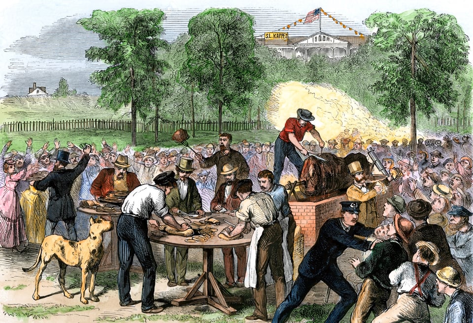 Barbecue greeted the inauguration of the Confederacy, and barbecue greeted its end, with vivacious and delicious annual celebrations of the Emancipation Proclamation in Black communities across the Southern and Southwestern states. By the mid-nineteenth century, though, barbecue had followed the shifting line of territorial expansion north and West, and with the notable exception of the Northeast, had become a pan-American institution of collective fare and celebration. It helped the temperance movement stage competing events to the drunken, masculine revelries of yore, ushering in Prohibition.
