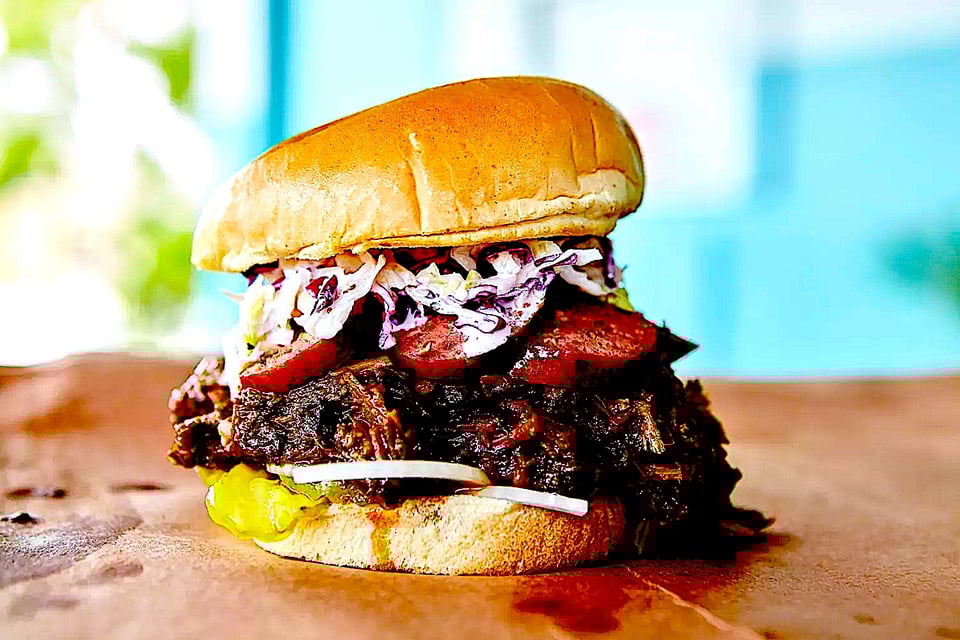 I reached Vaughn, the sound of trains whistling through the phone, in line outside Louie Mueller BBQ, an eighty-one-year-old institution in Taylor, Texas, to discuss the place of the sandwich within the broader world of barbecue. “The sandwich of old looks different than the sandwich today—the invention of the bun changed everything. You no longer have sliced bread that gets soggy and breaks apart immediately, and that didn’t change until they got buns. Nowadays I don’t think you’d picture a barbecue sandwich being on anything but a bun.”