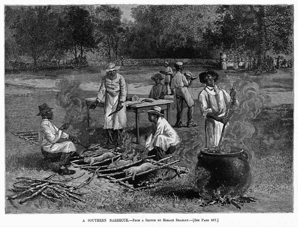 What is less often recalled is the barbecue that greeted Brooks when he returned to South Carolina, having defiantly resigned his post before he could be expelled from Congress. It was a massive affair, with between eight thousand and ten thousand attendees, the jubilant greeting of a proud hero. According to Barbecue: the History of an American Institution, by Robert F. Moss, the revelry included a band, political perorations, a parade, and five tons of barbecued beef, pork, and mutton. Moreover, this being South Carolina in 1856, it is almost certain that the people barbecuing these tons of flesh were enslaved. In the antebellum South, at the barbecues that greeted every civic celebration, those who laid the fires, set up the spits, basted the carcasses with sharp spiced sauce, and carved the flesh once the long, slow roasting was complete were enslaved. Only the eaters were white.