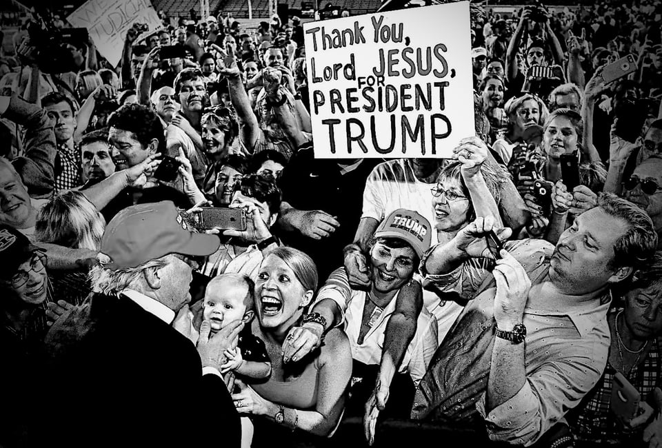 Most prominently in the broader cult of Trump, the strain of Apocalypse-obsessed white evangelical Protestantism that began gaining strength in earnest in the 1970s, enveloping tens of millions of Americans in a vision of imminent blood and hellfire, has reached its apotheosis behind a leader whose flaws are permissible and even admirable in a moral landscape that has long focused its ire elsewhere—on the civil rights of women and minorities, on education, on the very specter of social change itself. Trump, protean and canny, has welcomed the mantle of savior to all these people; the sheer scope and meandering nature of his pronouncements make them amenable to parse for omens and portents. And his gaping, wounded ego makes him comfortable in the role of prophet-redeemer to his multifarious flock.