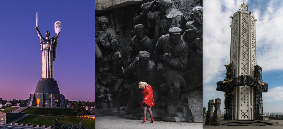 Kyiv, having seen so much death, is a city of memorials: surrounding the World War II Museum, there is a spectacularly Soviet memorial complex. To approach the museum, you must walk under a great concrete arch carved with a star, on which is written, in metal: “Their feats will live forever, their names are undying”; lining the tunnel are statues and bas-reliefs of heroic soldiers and laborers, a triumph of socialist realism in metal. And over the entirety of this presides the Motherland Monument, a two-hundred-foot woman holding a sword aloft, erected of stainless steel in 1981; she overlooks half the city, and she holds her shield up, and she never gets tired.