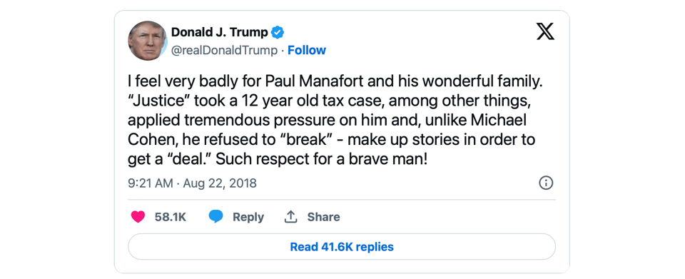According to Kost Bondarenko, one of Manafort’s Ukrainian associates, “Trump won because of Manafort” in 2016, and their reunion may have as much to do with winning in 2024 as it does with settling old debts. A decade ago, Manafort was down and out, and then the Trump campaign offered him a lifeline in exchange for his very particular set of skills. Six years ago, he was down and out once more, before Trump came to his rescue with a pardon. For both men, the stakes in the 2024 election couldn't be much higher: their freedom and livelihoods may hang in the balance. Of course, for the rest of us, with the rising threat of fascism and the survival of democracy on the ballot, the stakes are even higher.