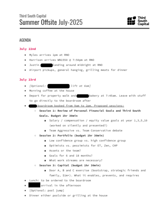 We began Third South Capital with an accidental offsite. In late-2022, Colin visited Richmond to brainstorm about some entrepreneurial ideas with me and Justin. We didn't call that meeting an offsite at the time, but it was: it was the offsite that formed Third South. Once we started Third South formally, our basic plan was to meet in person once per year. At that time, we were each managing other full-time obligations, and Third South was a part-time project for all of us. During “Third South 1.0”, offsites essentially consisted of asking: