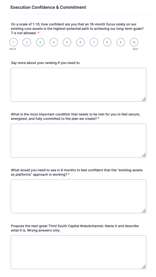There's some real fun and seriousness to our survey process. It's not anonymous. I write some joke questions ("If Colin was stuck on a desert island, what two of these four things would he bring…?"). But we try to tackle the major themes and issues the firm is facing. Some questions vary by season ("how much equity capital are you comfortable investing this year?") and others are evergreen ("what are examples of some of the elephants in the room right now?"). I take a stab at writing the questions.