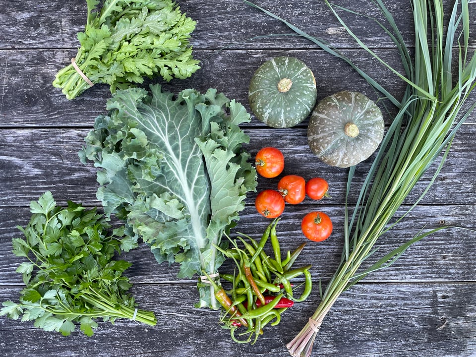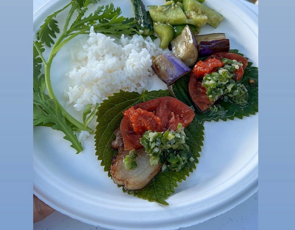 On Saturday morning, Elizabeth and I harvested a bunch of vegetables for lunch. We prepared a pork belly wrap buffet with perilla, chrysanthemum greens, tomatoes, eggplant, ginger-scallion sauce, and smashed cucumber salad. I forgot to take a picture of the spread, but thankfully member Lauren documented the day's lunch on Instagram: