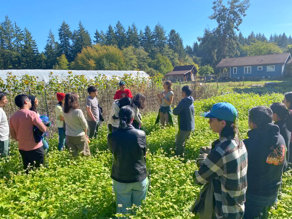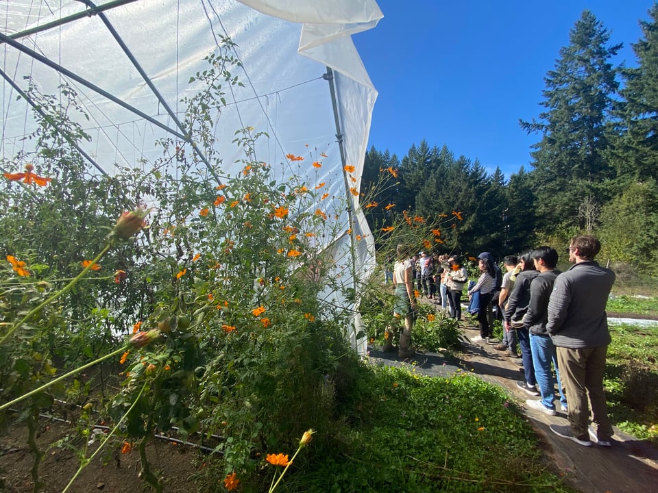 After lunch, Elizabeth led a tour of Tian Tian Farm. We started at the greenhouse, which for most of the season shelters our seedlings but currently houses our winter squash for their curing process. By the time you read this (or very soon after), you will have received two of our four varieties (delicata and kabocha). We're also growing red kuri and a mini butternut squash. Winter squash need to cure for at least 10 days for optimal flavor and storage, hence the greenhouse takeover.