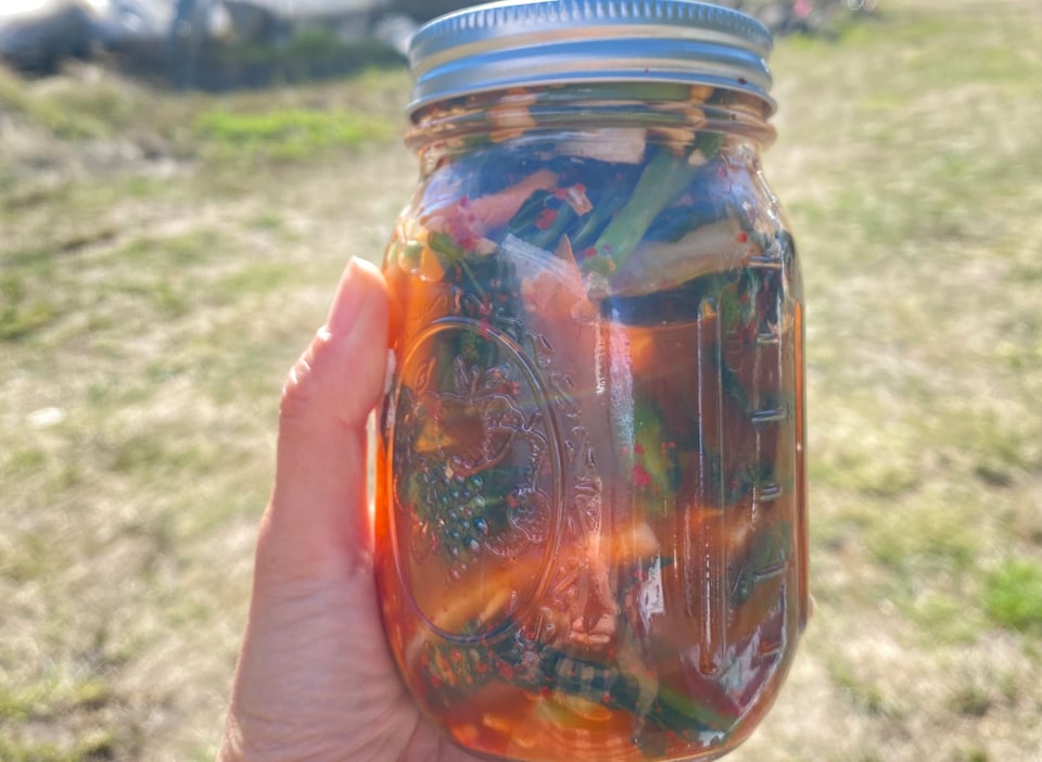 Finally, we gathered back at the tent to pack jars of kimchi with komatsuna, daikon, carrots, scallions, and gochugaru provided by members. (Thank you Lichun, Jonathan, Lauren, Vanessa, and anyone else who came to the pepper flaker rescue.) Elizabeth and I have been experimenting with fermenting this season to preserve our harvest after giving up on the long, tedious process of canning. We loved bringing you all into the fold. Without any advance notice, member Shaun — who just happens to be a pro food scientist — even gave a brief rundown on lactofermentation.