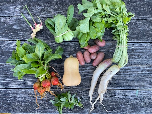 Rounding out your share this week are the familiar faces of baby bok choy, daikon, and golden beets. And also the guest appearance of red fingerling potatoes from our friends and fellow Vashonites at Provo Farms.