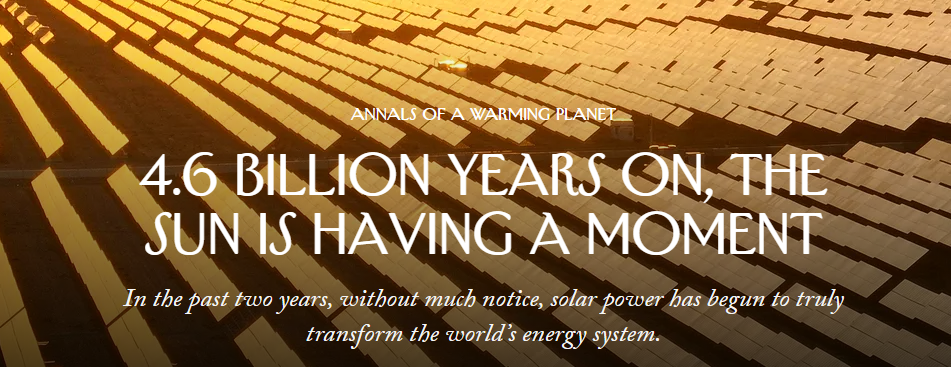 There are lots of other technologies vying to replace fossil fuels or to reduce climate damage: nuclear power, hydrogen power, carbon capture and storage; along with renewables, all were boosted by spending provisions in Biden’s Inflation Reduction Act and will be hampered to varying degrees by congressional rollbacks. Some may prove useful in the long run and others illusory, but for now they are statistically swamped by the sheer amount of renewable power coming online. Globally, roughly a third more power is being generated from the sun this spring than last. If this exponential rate of growth can continue, we will soon live in a very different world.