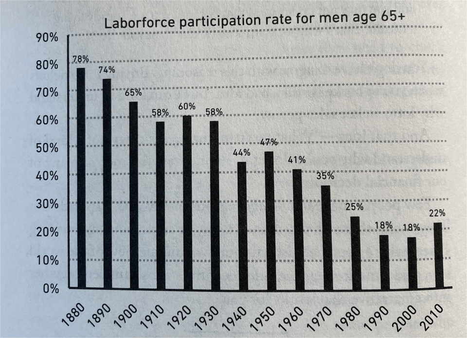 The concept of retirement is new. 100-odd years ago, a large percentage of men just kept on working. According to the author, "it wasn't until the 1980s that the idea that everyone deserves, and should have, a dignified retirement took hold."