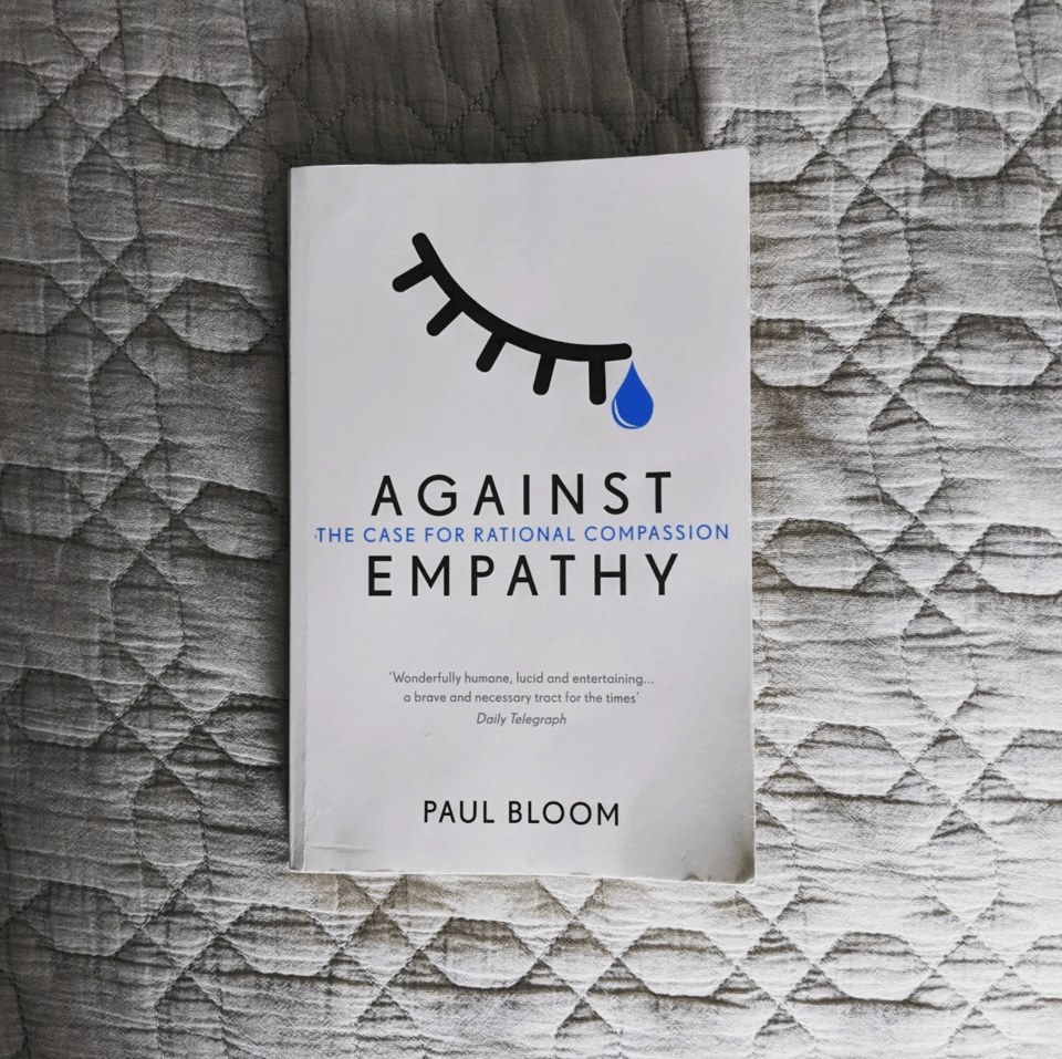 Let's clear up the obvious spiciness: Bloom is talking about the difference between "I feel things that I think other people feel" and proper cognitive empathy. As in the former bad, the latter ok. But more than this, he argues that empathy, as heartwarming as it is, is shipped with some serious bugs: it's biased, with much more if it given to those similar to us, and it's irrational, and in particular, innumerate, tricking us into privileging the plight of one over the more utilitarian many.