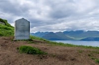 A tombstone stands alone atop the cliffs of Kalsoy, Faroe Islands, marking the grave of James Bond. The iconic fictional British spy lost his life in the film No Time To Die.