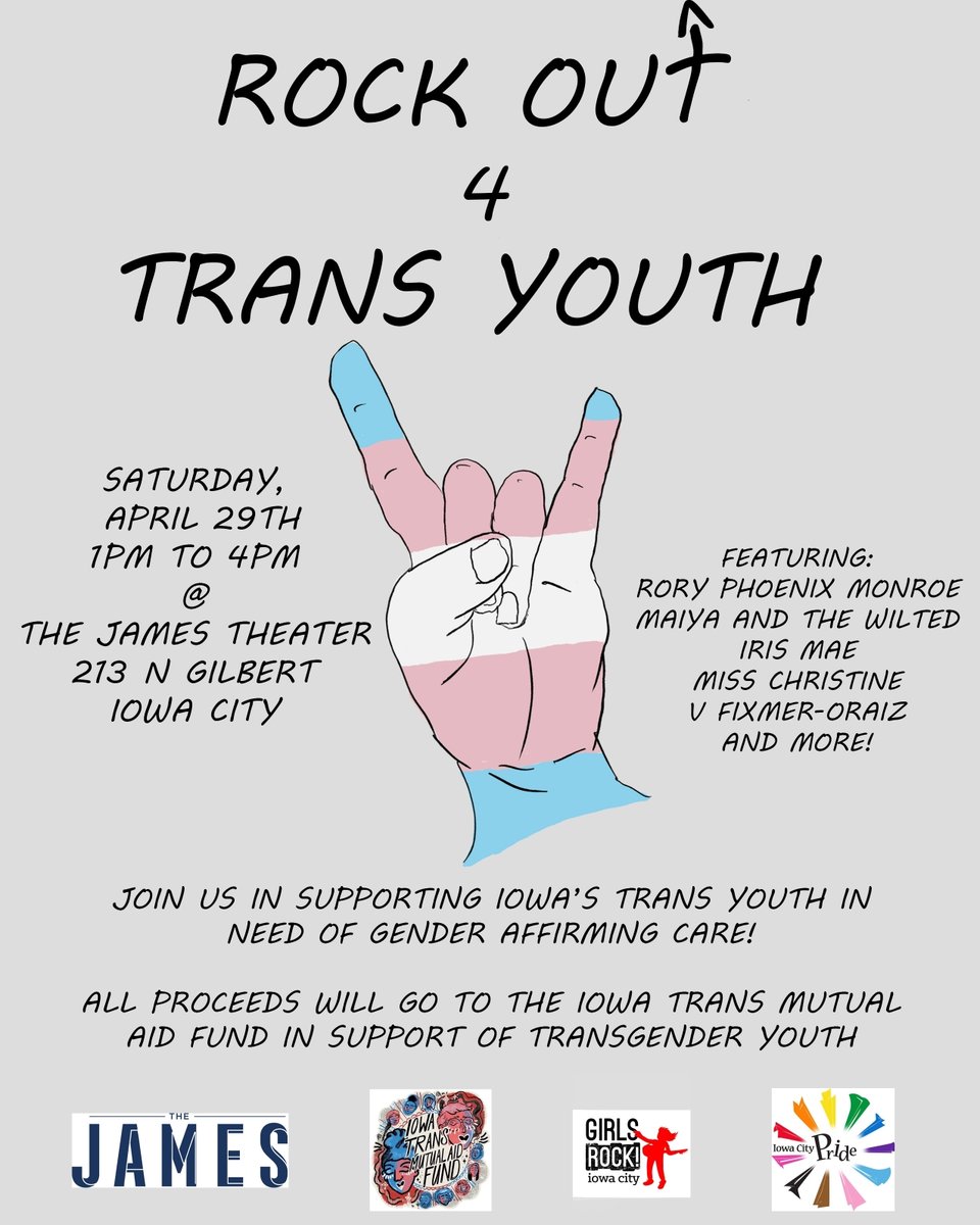 Hey everyone! There's going to be an amazing show this coming Saturday, in support of trans youth in Iowa. A chance to build community, raise money for a great cause, and of course: ROCK OUT. Hope to see you there!