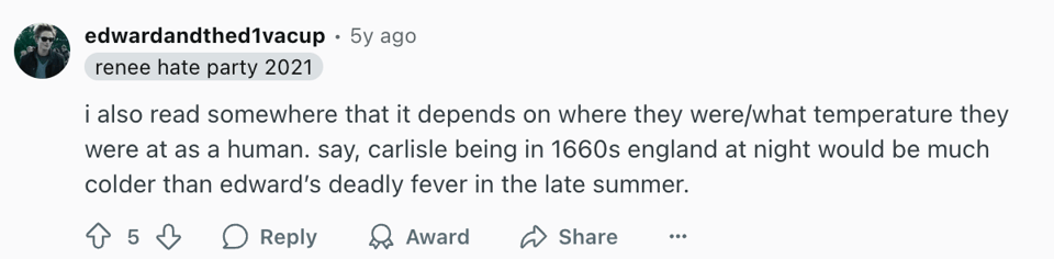 Renesmee's birthday is 9/11? This is what I’m talking about, in terms of Meyer’s uncanny choice abilities. Like, give her the smallest choice to make and she will still knock it out of the park 10 times out of 10. Also Renesmee’s canonical body heat is like 105 degrees. Why would someone who is half normal human and half cold vampire be hotter than either? If you were looking for answers instead of more questions you’ve come to the wrong place. It turns out there is no canonical information about vampire core temperatures; they might just not produce heat at all, meaning they’re always the temperature of the air around them, or there’s also whatever this explanation is that I found on Reddit.