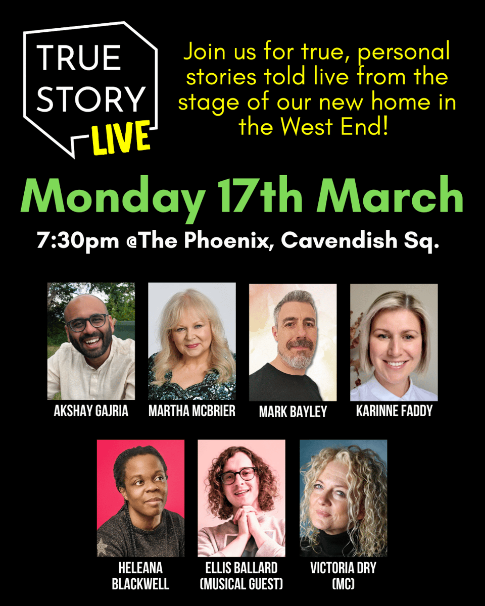We’re back! Join us Monday at 7:30 pm for our first show of 2025 — a night of funny and unforgettable stories at The Phoenix Cavendish Square, hosted by our dazzling MC Victoria Dry. Come early for a bite or a pint and get 10% off by mentioning True Story.