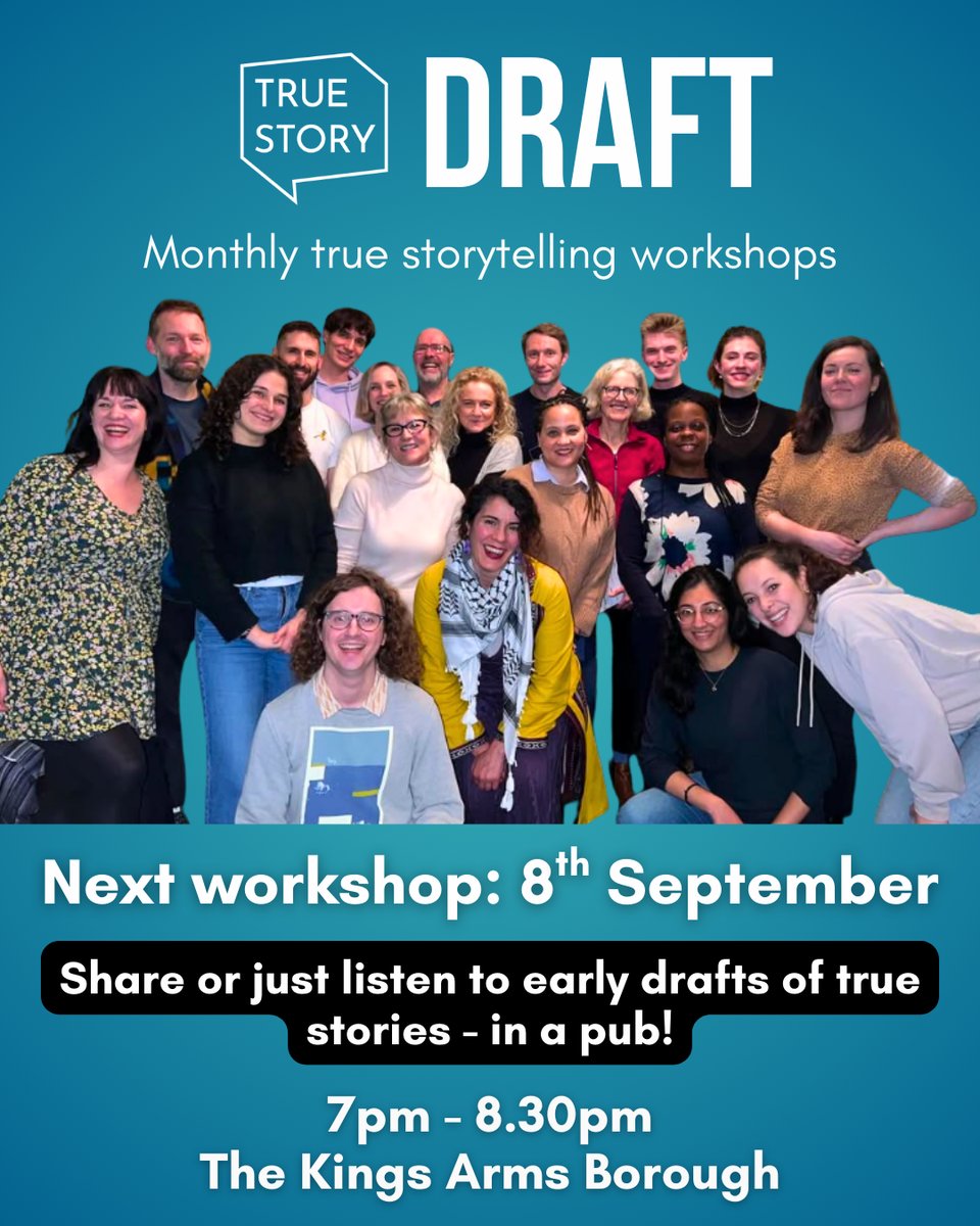 Our next DRAFT workshop is Monday 8th September at The King’s Arms, London Bridge. It’s a welcoming space to try out your story, get feedback, and connect with fellow humans. Prefer to just listen? Grab a listener ticket and come along.