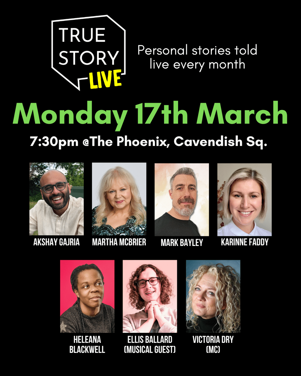 We have big news for 2025 and want you to be the first to know: True Story LIVE is back! Starting March 17th, we’ll be on stage every month with a stellar lineup of storytellers at our new home in the West End. Book your tickets here!
