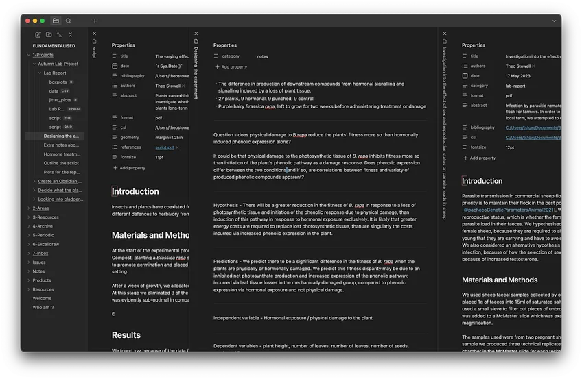 I can open the same project folder in RStudio and edit the R scripts for the plots seamlessly, whilst being able to edit the text of the main script with all the notes and past lab reports in my vault that I might need for reference.