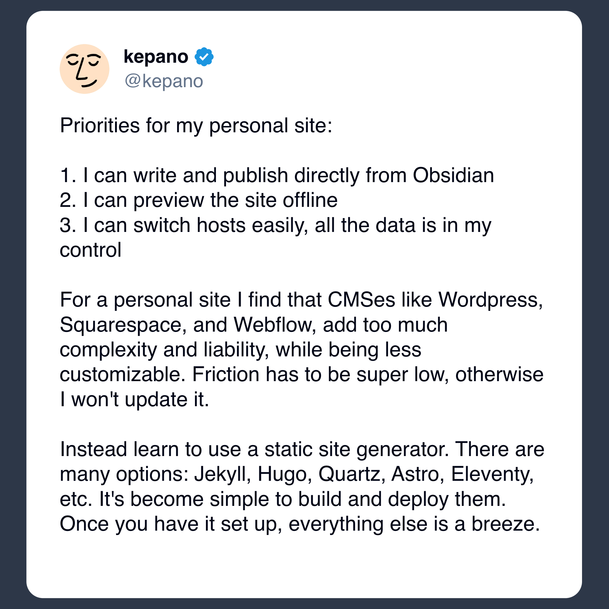 A few days ago, I was procrastinating in the main library at university when I saw a tweet from Steph Ango, talking about using Obsidian and a static site generator to build a website based on text…