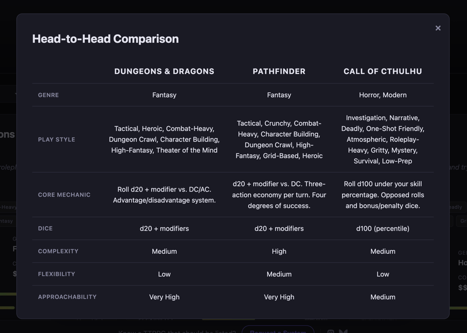 This is the one I’m most excited about. You can now pick up to 4 systems and compare them side by side: mechanics, complexity, genre, all of it laid out so you can actually see the differences. No more opening six tabs and trying to remember what you just read.