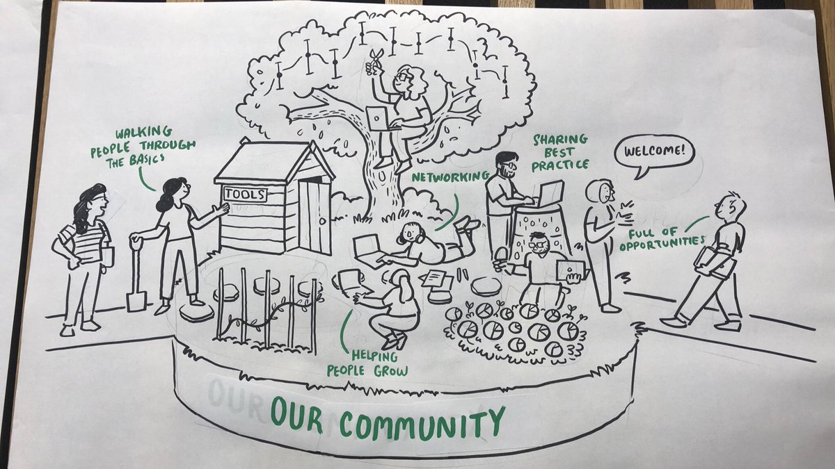 We were busy organising and running two very succcessful book dashes in May. Our events in Manchester and London were great opportunities to grow the Turing Way community and we were really lucky to be joined by Matt, an illustrator from scriberia, who captured our book dashes wonderfully: