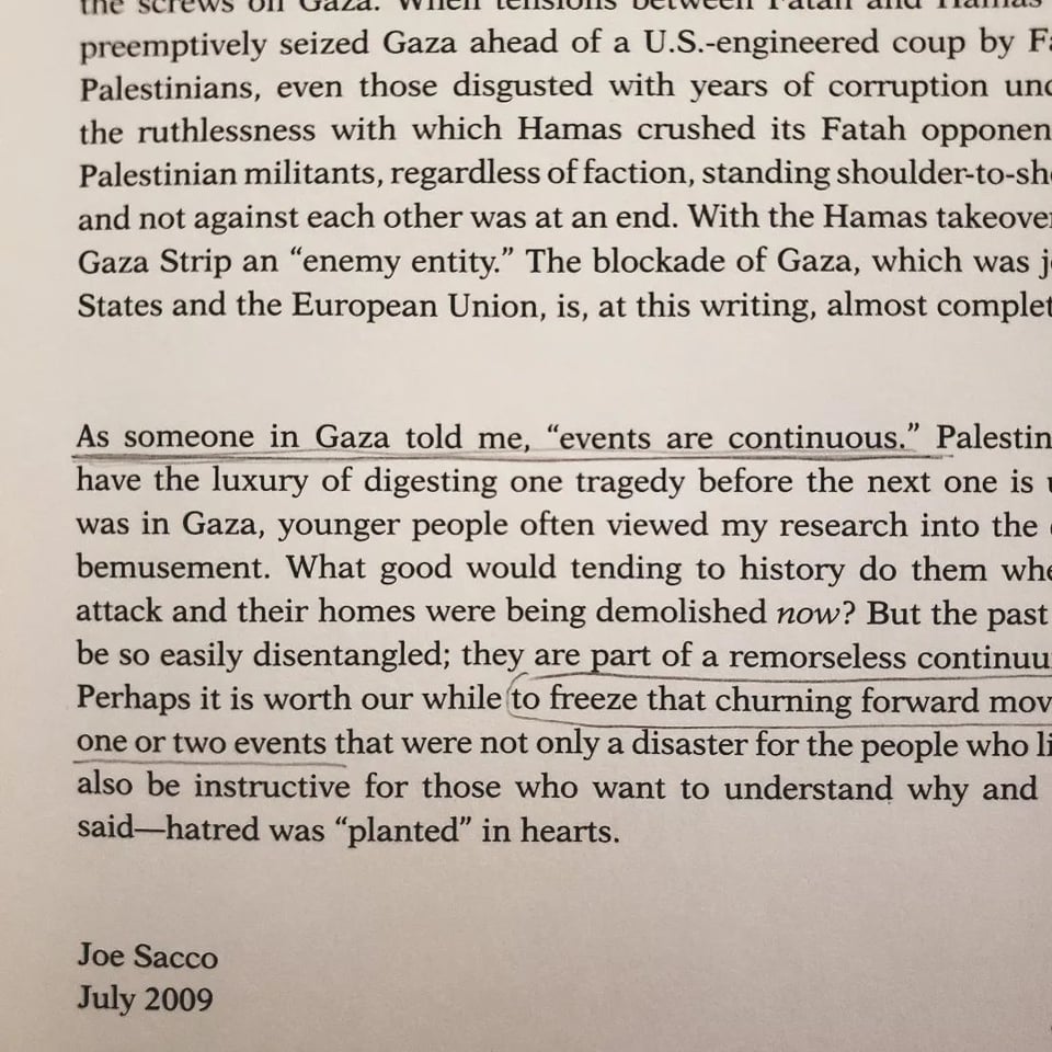 I've been thinking a lot about Joe Sacco's Footnotes in Gaza, which I've been slowly re-reading since Hamas attacked Israel on October 7.