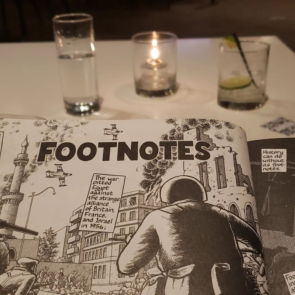 I'm not naive enough to think a book recommendation will ameliorate the current suffering in Gaza, or push Israel to stop its vicious, catastrophic bombing of Palestinians. But this is a space for books, and I am here to gently suggest you find a copy of Footnotes. For me, it's been just as valuable as any prose book I've read about Palestine and Israel.