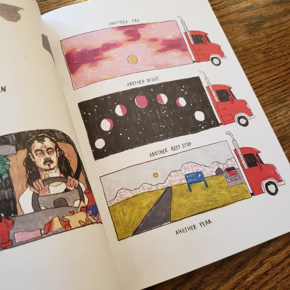 I’m on the record in a past review saying critical things about a comic that dispensed with traditional panels to tell a story about human loneliness. But I actually like the effect in 10-10 to the Wind. The open page design and lack of regular structure helps convey what it must feel like to spend your life driving through endless, sweeping landscapes without human contact. In fact, the one part of the book that didn’t work was a page that adopted a Will Eisner–esque style of using objects — in this case, the protagonist’s truck — as symbolic panels. It felt like an odd stylistic detour. But it certainly wasn’t enough to ruin my enjoyment of this great comic.